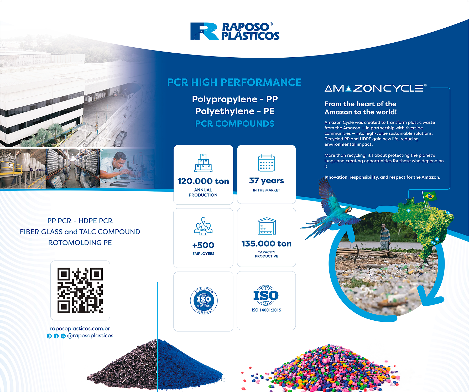 To ensure compliance with technical data sheets, the company operates a modern R&D laboratory that guarantees that defined mechanical properties are met. Raposo Plásticos is ISO 9001 certified and employs more than 500 people. It offers quality products and seeks long-term partnerships, reaffirming its commitment to providing sustainable, innovative, and reliable solutions to global partners. Its main products include PP, PE, and PS.